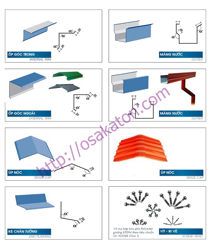 Hình ảnh dưới đây sẽ liệt kê những phụ kiện làm mái tôn có tại kho chúng tôi